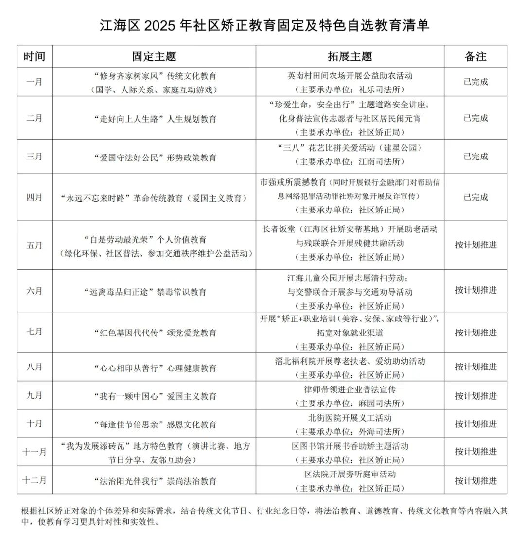 为全面提升社区矫正教育帮扶质效,江海区社区矫正管理局推行“清单式管理+精准化服务”模式,以目标为导向,精准施策、多方联动,着力破解教育帮扶难点,助力社区矫正对象顺利回归社会,为社会治理现代化注入新动能。