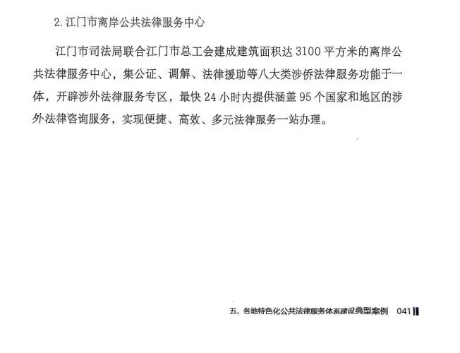 日前,中国法治出版社出版了《中国公共法律服务体系建设年度报告(2024年)》,江门市华侨华人离岸公共法律服务中心成功入选各地特色化公共法律服务体系建设典型案例。这是继2024年3月江门市公共法律服务中心获评“全国公共法律服务工作先进集体”后,江门在公共法律服务领域斩获的又一殊荣。