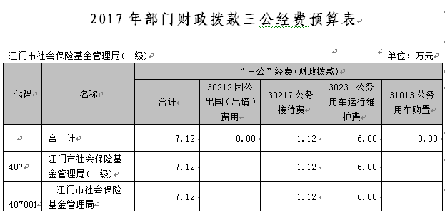 2017年江门市社会保险基金管理局用财政拨款数开支的出国(境)经费、车辆购置及运行费、公务接待费(简称“三公”经费)支出合计7.12万元。