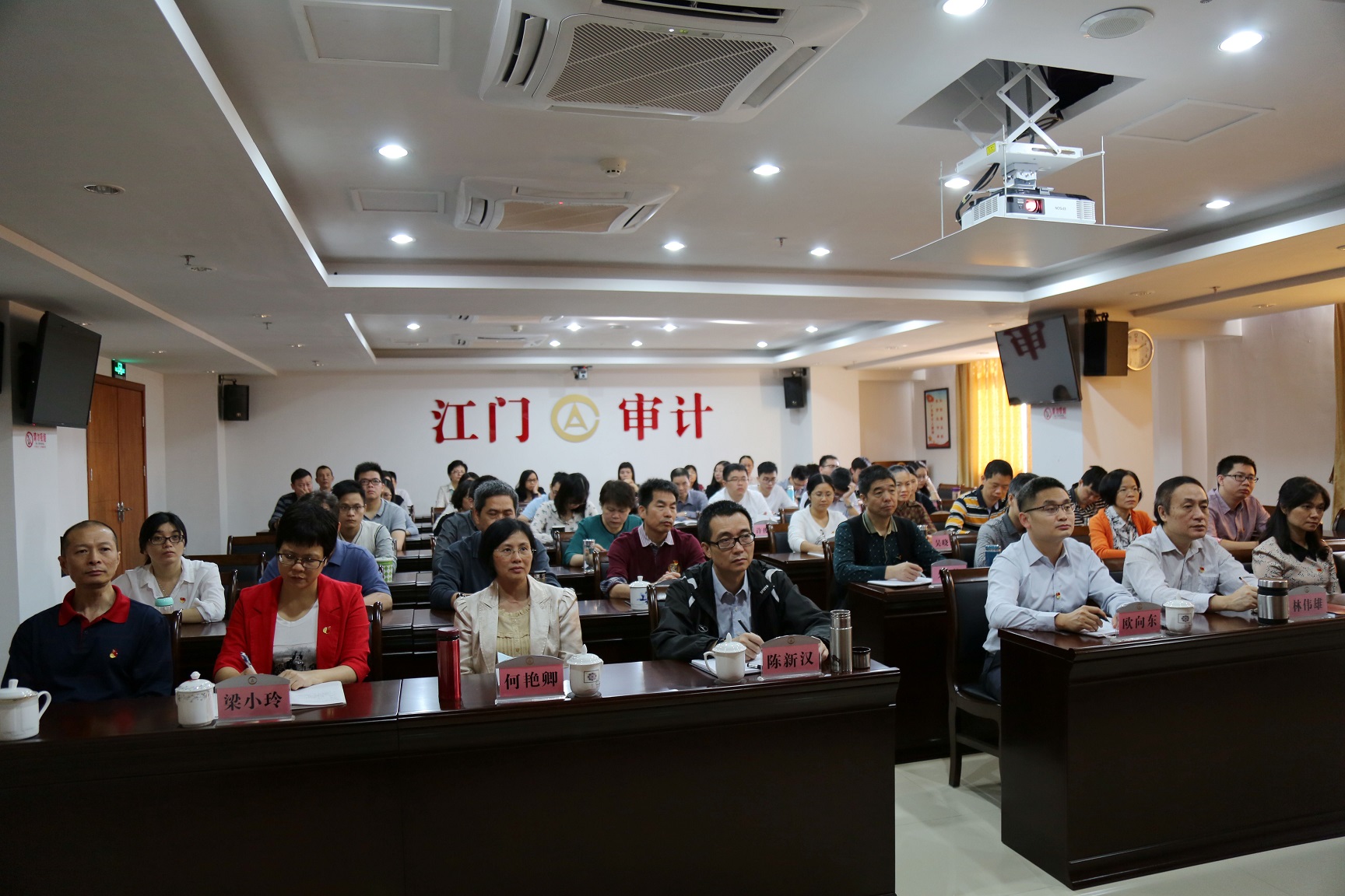 省审计厅赴江门审计组、江门市镇(街)党政主要领导经责异地审计组在江门市局会场同步收看了党代会,我局赴鹤山审计组在鹤山市审计局会场收看。