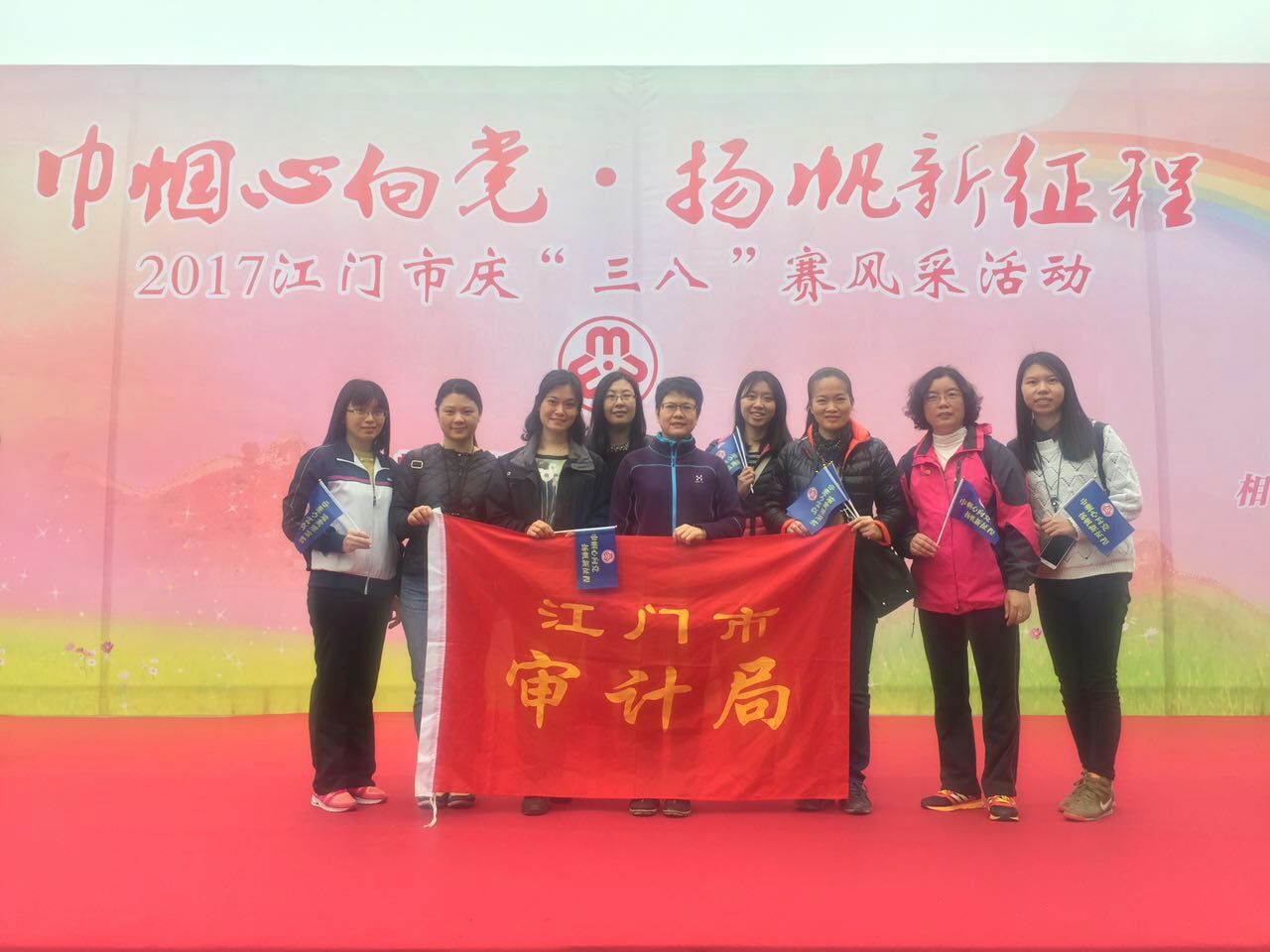 3月7日,市审计局副局长梁小玲、凌健能带领7名女同志到江门市群星公园,参加市妇联举办的“巾帼心向党 扬帆新征程”庆三八赛风采活动。