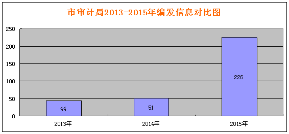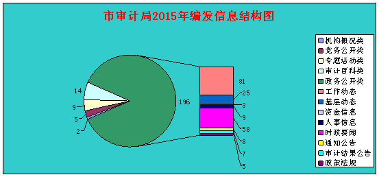 2015年在局门户网站发布政府信息226条,包括机构概况类信息2条,政务公开类信息196条,党务公开类信息5条,专题活动类信息9条,审计百科类信息14条。其中政务公开类信息有工作动态81条、基层动态25条、资金信息3条、人事信息9条、时政要闻类信息58条,通知公告8条,审计结果公告7条,政策法规5条。在江门市政府信息公开目录系统发布政府信息104条,含太阳3娱乐1条,信息公开工作报告1条,组织机构类信息1条,部门文件类信息5条,办事指南类信息2条,工作动态类信息80条,部门财政预决算类信息2条,“三公”经费类信息1条,其他通知公告类信息4条,审计结果公告7条。