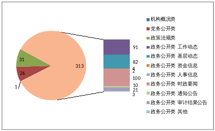 2018年,在局门户网站发布政府信息421条,主要包括政务公开类信息313条,党务公开类信息26条,政策法规类信息31条,专题专栏发布9条,审计园地专栏发布37条。其中政务公开类信息有工作动态91条、基层动态82条、资金信息4条、人事信息2条、时政要闻类信息100条、通知公告10条,审计结果公告21条,其他信息3条。