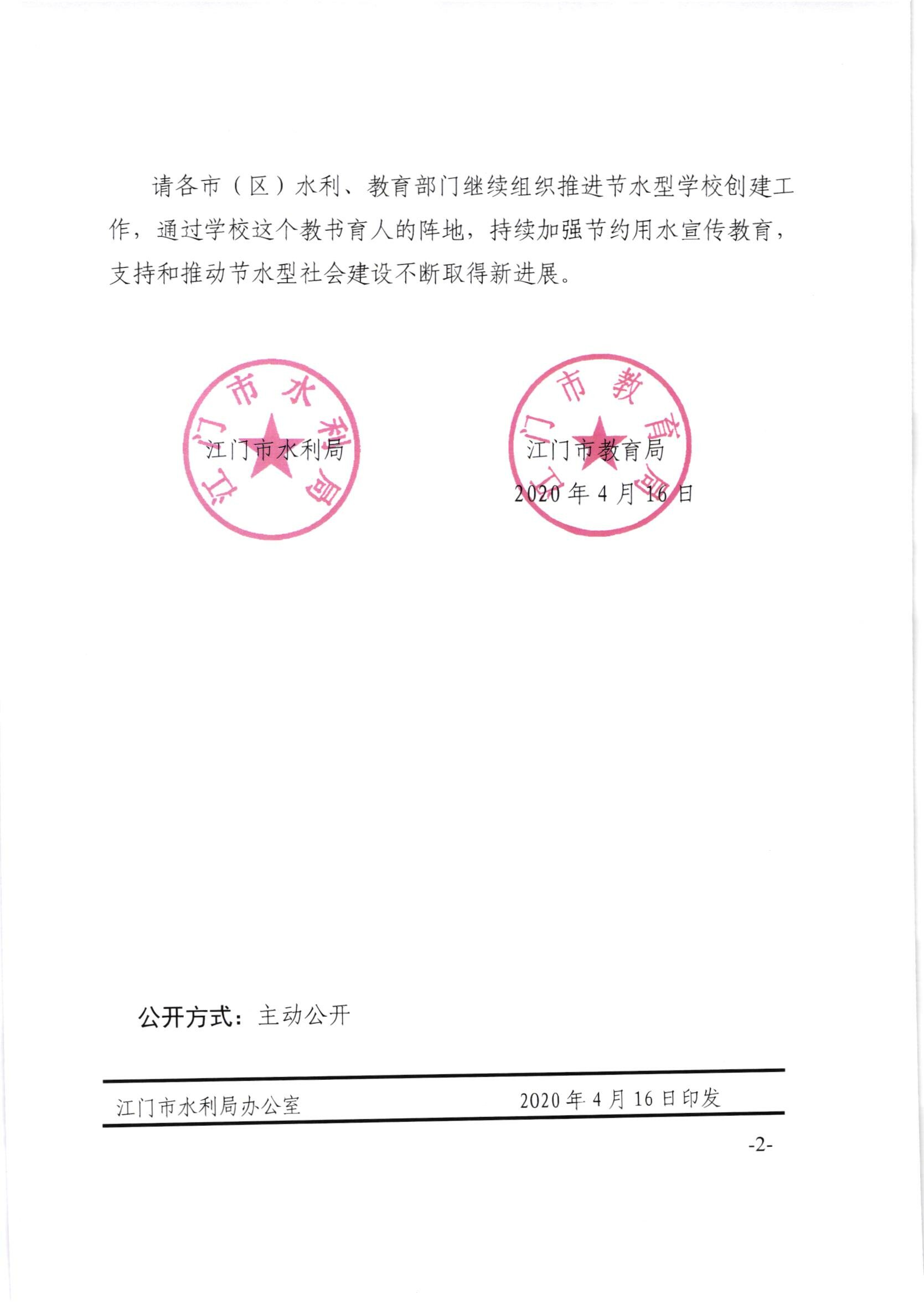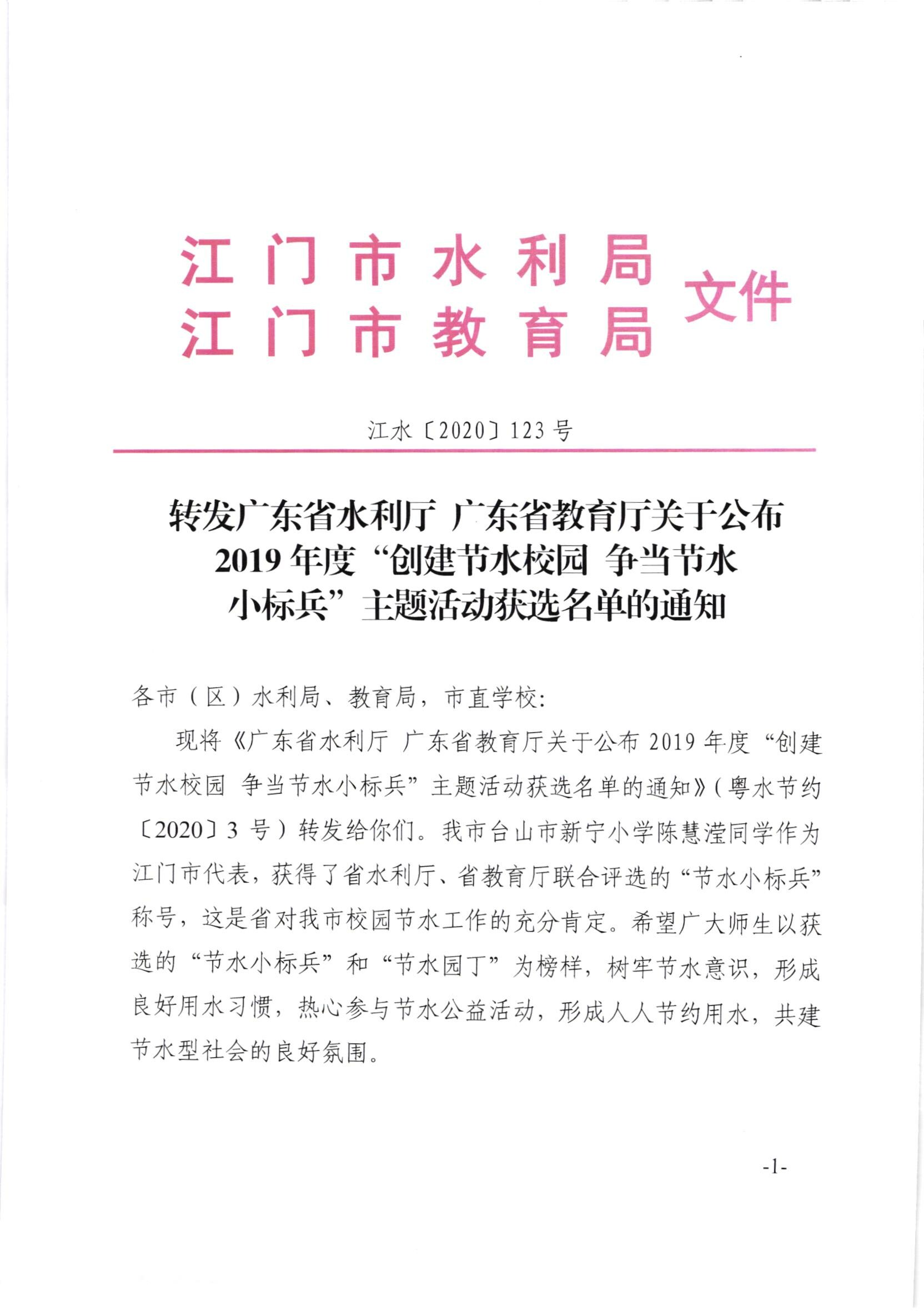 转发广东省水利 广东省教育厅关于公布2019年度“创建节水校园 争当节水小标兵”主题活动获选名单的通知_公示通告_江门市水利局