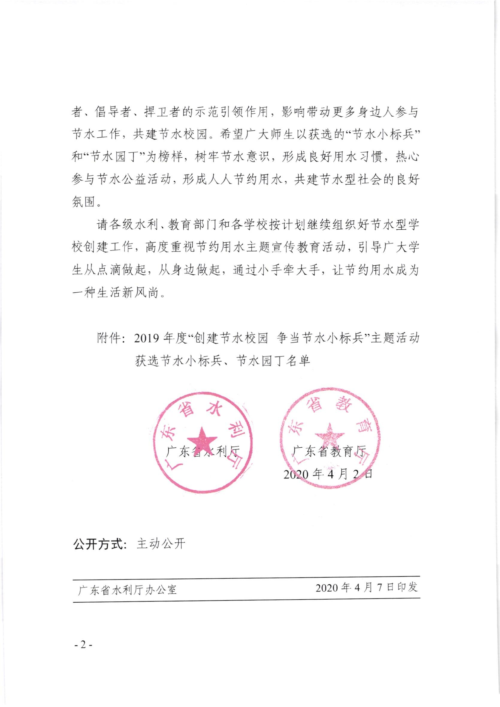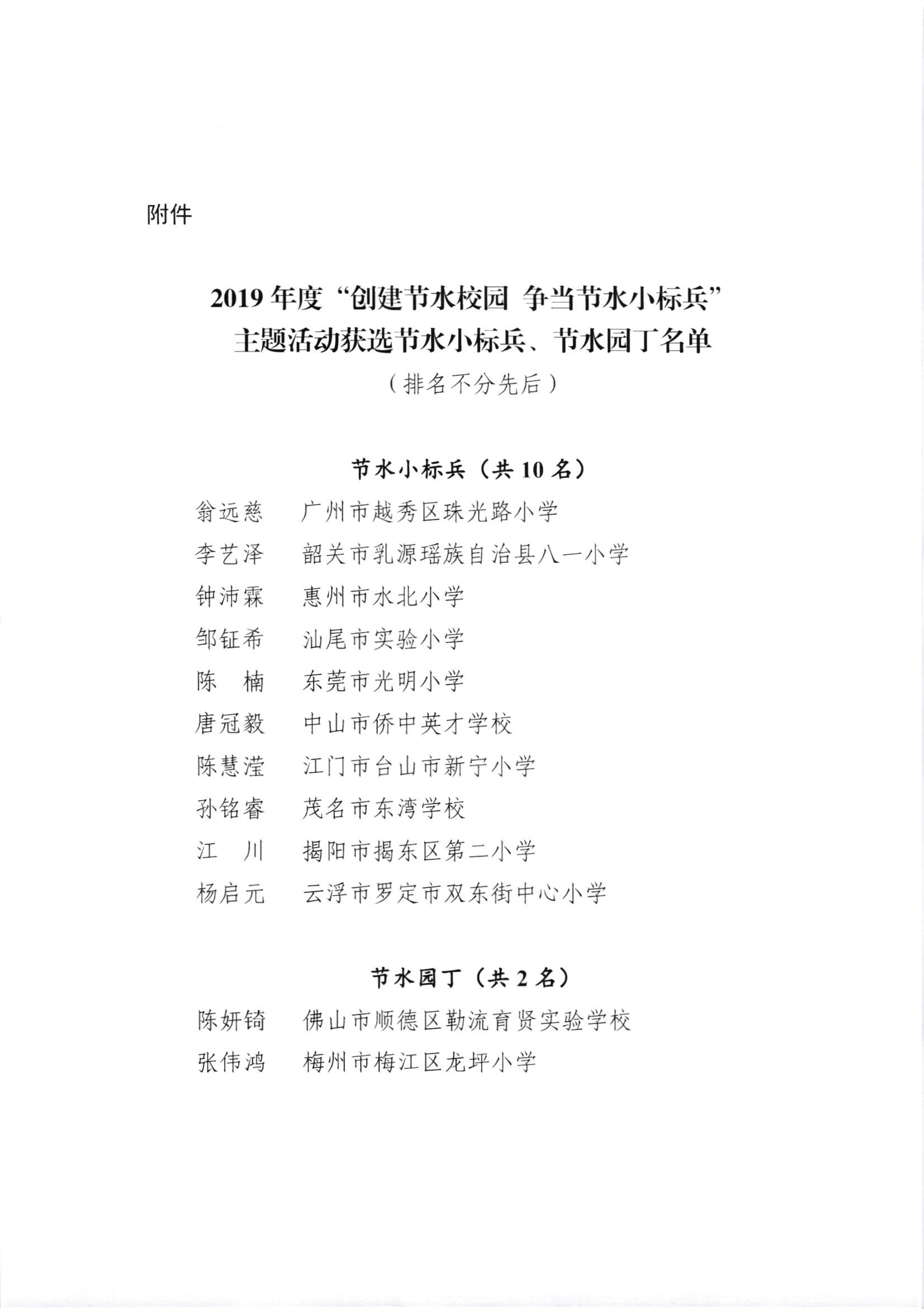 转发广东省水利 广东省教育厅关于公布2019年度“创建节水校园 争当节水小标兵”主题活动获选名单的通知
