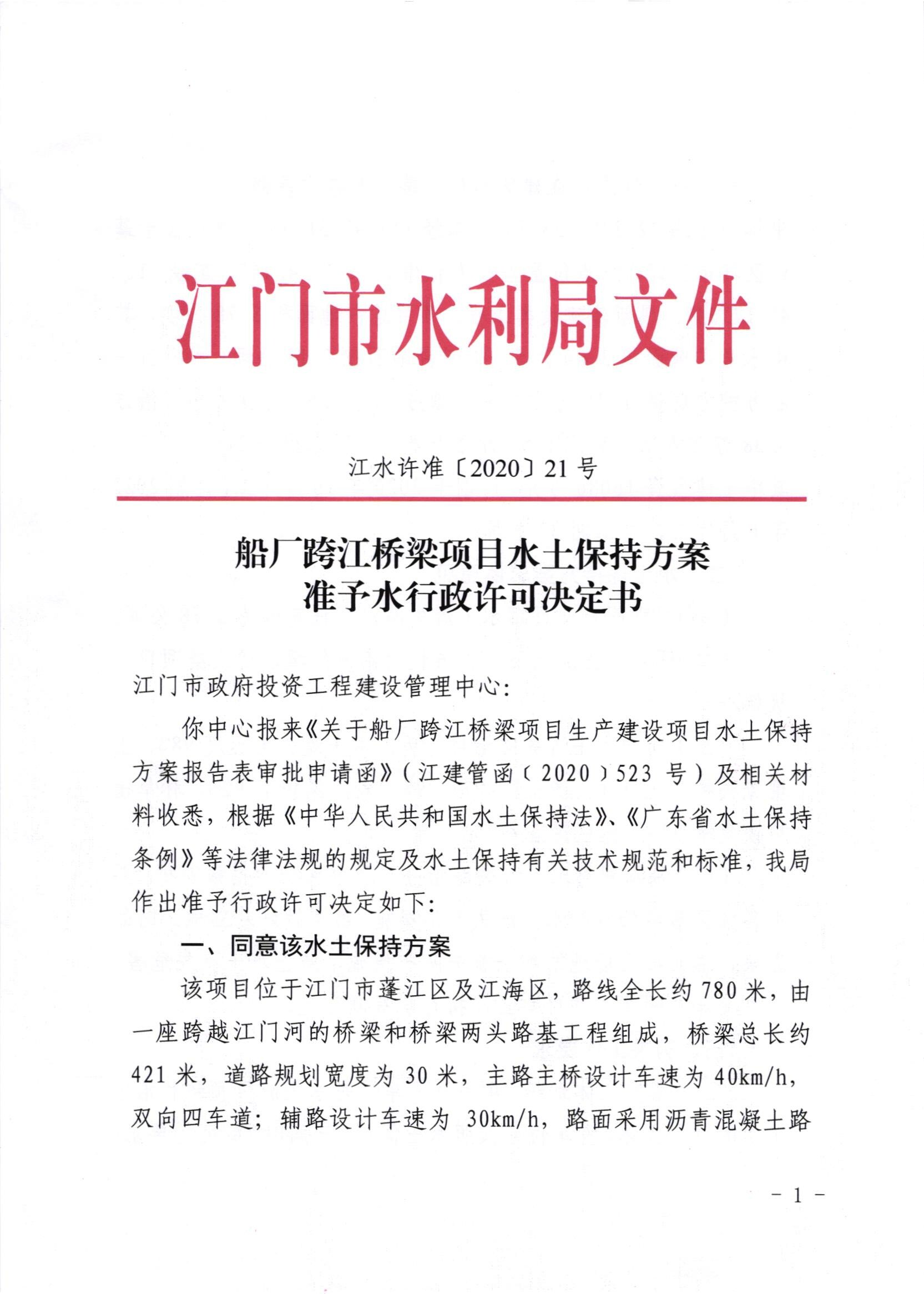 船厂跨江桥梁项目水土保持方案准予水行政许可决定书_公示通告_江门市水利局