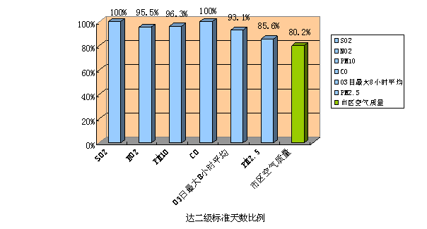 2014年市区二氧化硫(SO2)年均浓度值为24微克/立方米比,2013年下降11.1%,达国家二级标准天数比例为100%;二氧化氮(NO2)年均浓度值为32微克/立方米,比2013年下降3.0%,达国家二级标准天数比例为95.5%;可吸入颗粒物(PM10)年均浓度值为64微克/立方米,比2013年下降15.8%,达国家二级标准天数比例为96.3%;一氧化碳(CO)达国家二级标准天数比例为100%;臭氧(O3)达国家二级标准天数比例为93.1%;细颗粒物(PM2.5)年均浓度值为44微克/立方米,比2013年下降12.0%,达国家二级标准天数比例为85.6%。