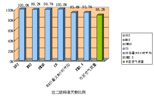 2015年江门市区空气质量达标天数322天,达标天数比例为88.2%,其中优181天、良141天、轻度污染40天、中度污染3天,未出现重度及严重污染天气。