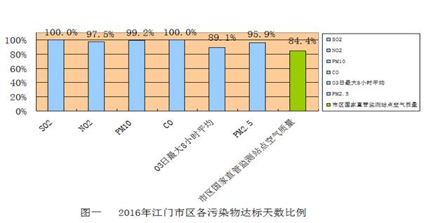 2016年蓬江、新会、台山、开平、恩平及鹤山等两区四市空气质量达标天数比例在83.7%~98.3%之间,平均为89.8%。