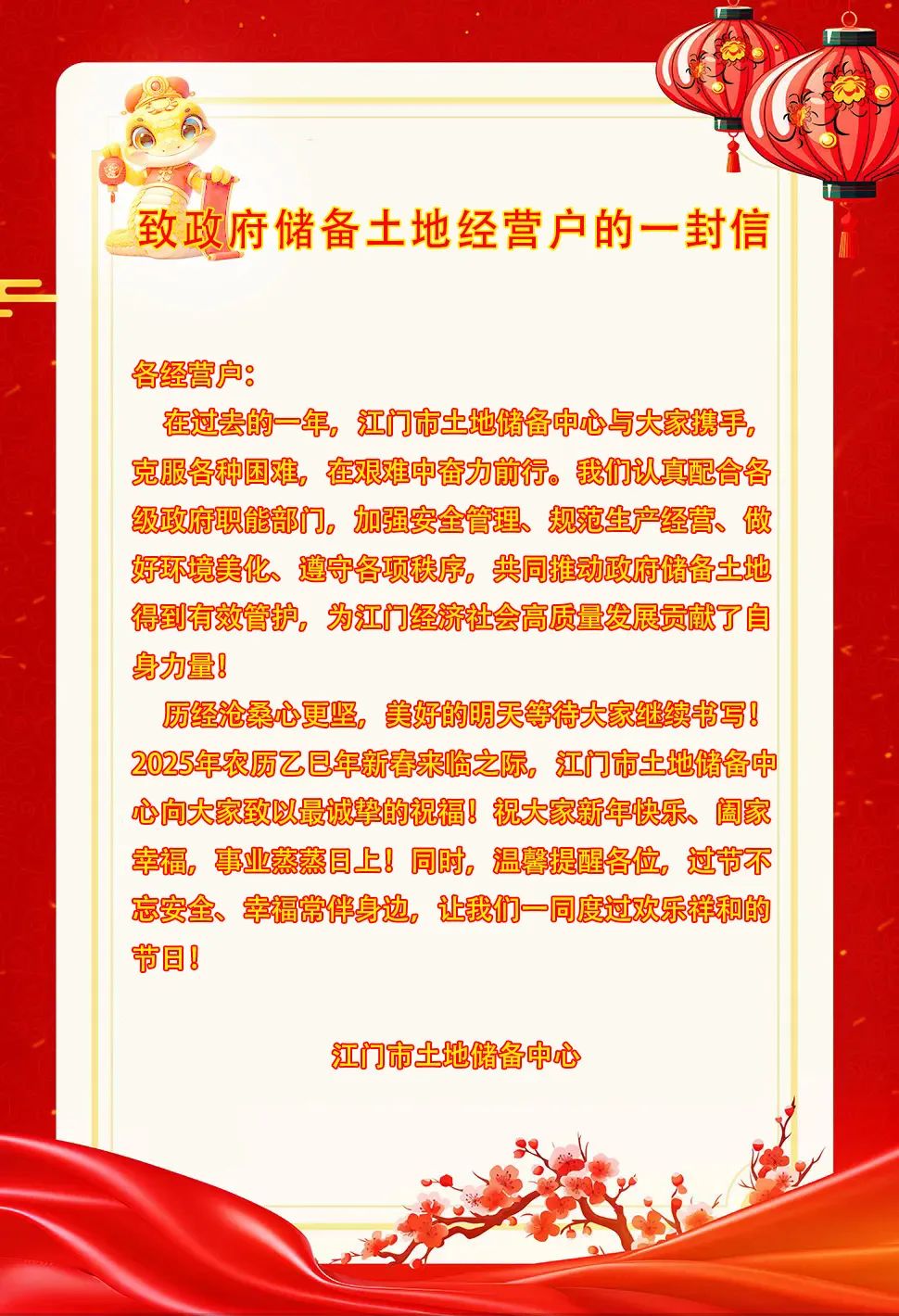 致政府储备土地经营户的一封信_通知公告_江门市土地储备中心