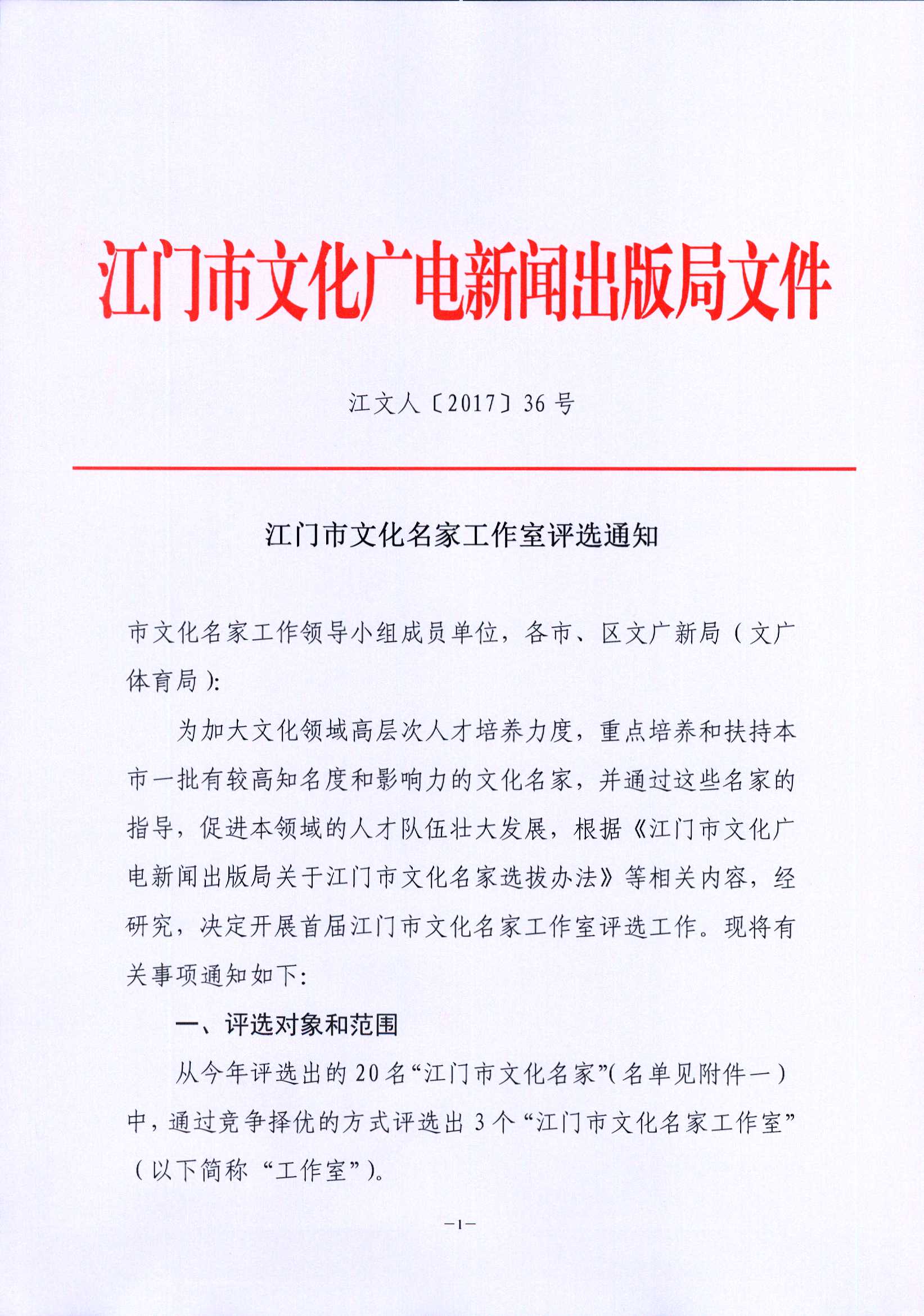 【文件】江门市文化名家工作室评选通知(江文人〔2017〕36号)_法治宣传_江门市文化广电旅游体育局