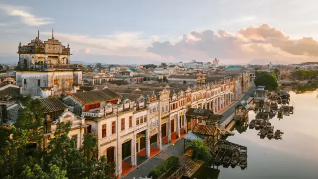 赤坎·广东华侨国际旅游度假区(简称:赤坎华侨古镇)位于中国第一侨乡——广东省江门市,是全国首个沉浸式华侨文化旅游度假区。其不仅有关氏、司徒氏两大宗族在百年竞争与协调中促进整个镇区建设发展的故事,还保留着600多座、绵延近3公里、中西合璧精妙绝伦的侨乡古骑楼建筑群,是全国规模最大、界面最连续、保存最完整的侨乡古骑楼建筑群,被誉为“令人震撼的中西建筑艺术长廊”,与世界文化遗产“开平碉楼与村落”一起发挥着其独特的魅力与价值。