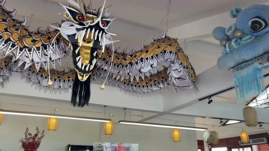 旁边还挂着各种狮头。