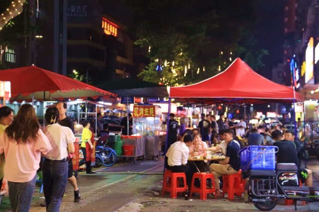 在新湖路的大排档夜市里,来自五湖四海的美食齐聚一“街”。浓香鲜甜的砂锅粥、清润脆滑的椰子鸡、麻辣鲜香、爽嫩Q弹的肥肠牛蛙……热闹的夜市街把白日的烦恼洗净,就能把普通的夜点缀得有滋有味。