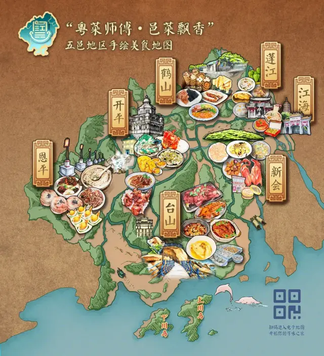 新会区是与广州、潮州并称“岭南三大古州”的古城之一,靠山面海,河网密布,水净质优,土地肥沃,物产丰饶,其中最为出名的当属新会陈皮、古井烧鹅;此外还有睦洲黄沙蚬、崖西甜水萝卜等特色食材。