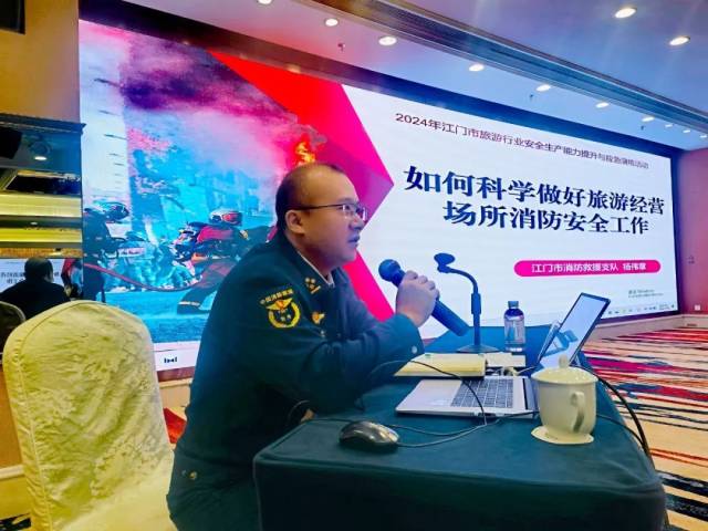 在上午的安全主题授课环节中,分别邀请江门市安全生产管理协会综合管理部部长、注册安全工程师李永金和江门市消防救援支队办公室一级助理员,大队级正职杨伟章就《如何避免旅游行业重大风险安全隐患》和《如何科学做好旅游经营场所(酒店、民宿)的消防安全工作》等专题进行授课,深入剖析一些重特大旅游安全事故案例,重点围绕防灾避险关键节点、游客聚集场所的消防与应急管理等工作展开详述。