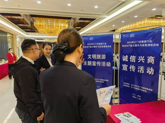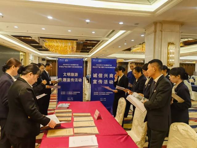 活动期间,江门市文化广电旅游体育局联合市旅游行业协会、开平潭江半岛酒店结合安全生产、安全出行主题向酒店住客和员工开展江门市文明旅游主题和诚信经营宣传活动。