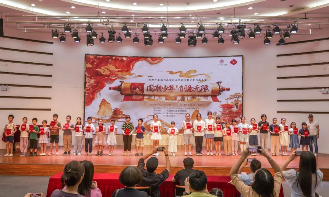 五千年文脉跃然纸上,新时代少年执笔生辉。7月22日,由江门市文化馆、江门市关心下一代工作委员会主办,江门市启翼文化发展有限公司承办,江门蒲公英艺术培训有限公司、江门杨之光美术协办的2025《国潮少年 创意无限》美术作品学习成果评选颁奖暨优秀作品展览开幕仪式在江门市文化馆举行。江门市文化馆副馆长张思斌、广东省美术家协会会员汤洪贵、江门市民间文艺家副主席陈白山等领导嘉宾以及参与此次活动的师生代表们齐聚一堂、共襄盛举。