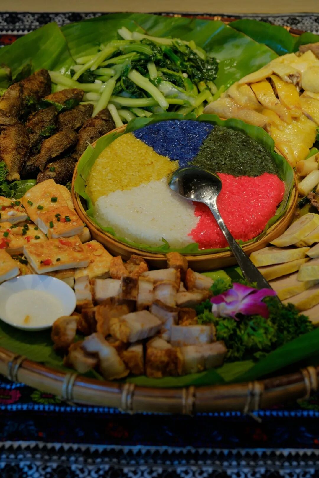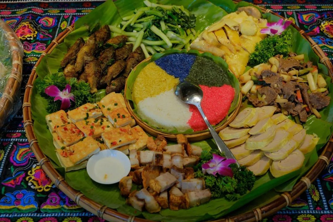 竹编簸箕里摆满五色糯米饭、香煎河鱼、