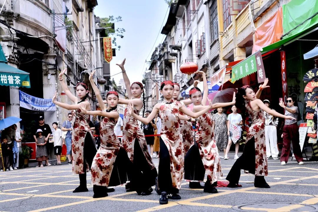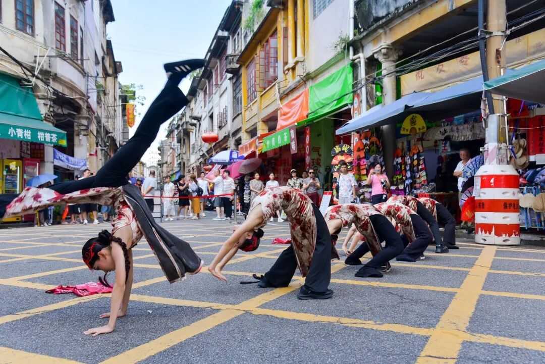 7月26日下午,在长堤历史文化街区的大、小“黄格子”路段,由江门市文化馆精心策划的“墟街有戏”街舞专场如约上演,为骑楼老街注入了青春的时代韵律。