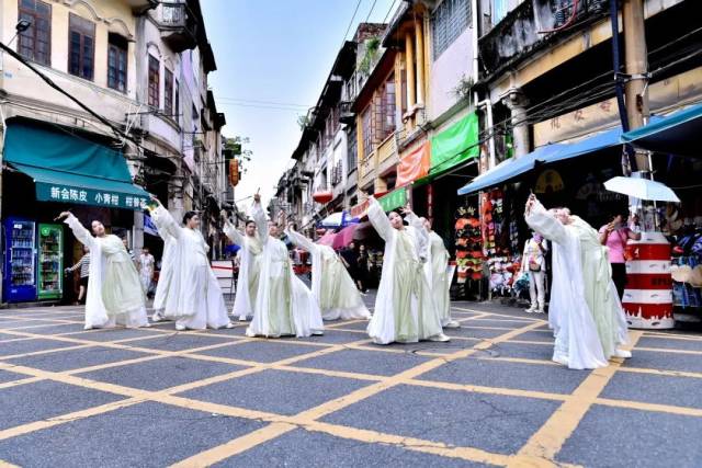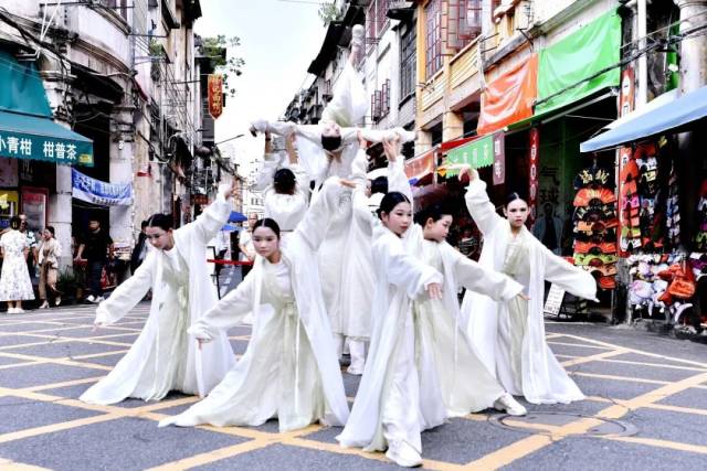 下午3:15分,身着各式精致服饰的年轻舞者们以街舞为媒,开启了一场时空对话。《上官婉儿》以现代肢体语言重构古典气韵,刚柔并济;《先生,我想写封信给你》则巧妙融合书信文化情怀,在动感中流淌深情;《大展宏图》以恢弘气势点燃现场,传递奋进力量;《行进音乐》更将表演化为流动的风景,舞者与市民、游客在骑楼街巷穿行互动,青春律动与历史光影交织共鸣。