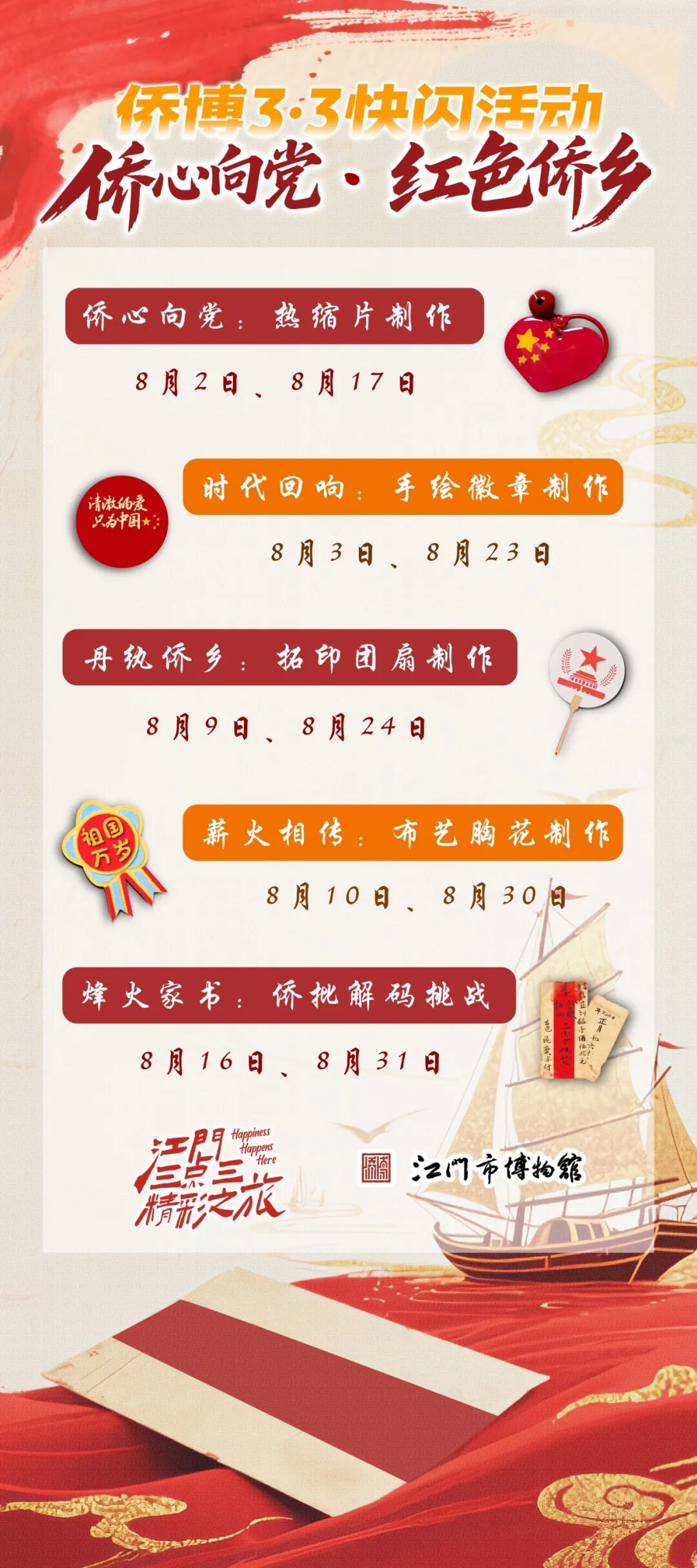 红色记忆不褪色,侨乡精神永流传!这个八月,让我们在侨博馆相遇,以手作铭记历史,用初心点亮未来,红色侨乡的故事,等您来续写新篇!