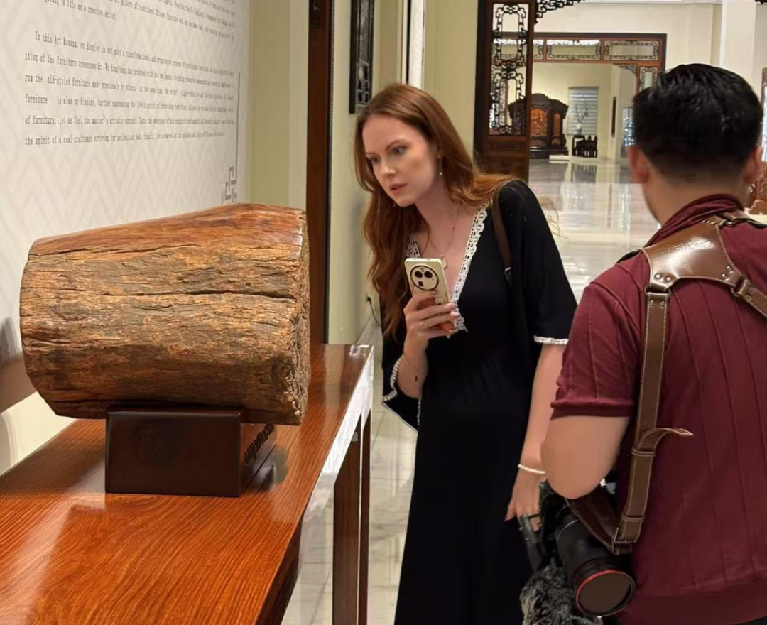 6位中外博主还参观了伍炳亮黄花梨艺博馆。馆内陈列着众多由黄花梨制作而成的家具和工艺品,这些作品造型精美、工艺精湛,展现了中国传统家具文化的魅力。“这些家具简直就是艺术品,每一件都凝聚着工匠们的心血和智慧。”丹麦博主欧珠丽表示,通过参观艺博馆,不仅了解了中国传统家具文化,更感受到了江门对传统文化传承和保护的重视。