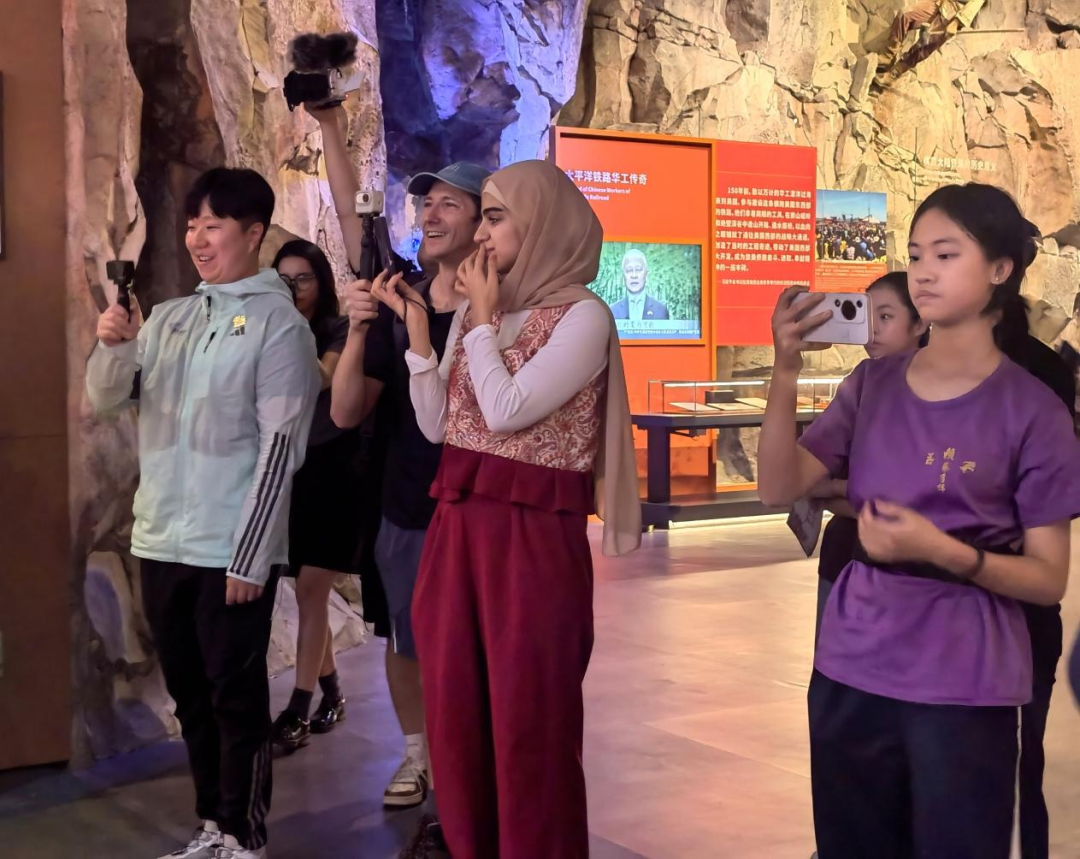 “这些华侨的故事太令人感动了,他们的坚韧和爱国情怀让人敬佩。”来自澳大利亚的博主韩森山(Jake Hines)一边认真聆听,一边用运动相机记录着展品。在博物馆的互动体验区,韩国视频博主金峻范通过多媒体设备,沉浸式感受了华侨当年的航海历程,更深刻地体会到了他们的不易与执着。