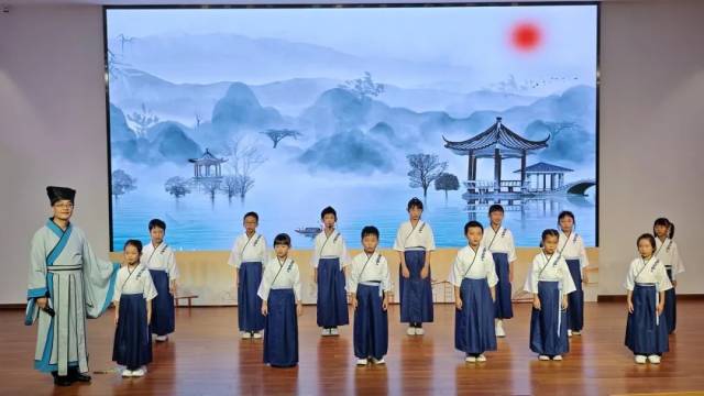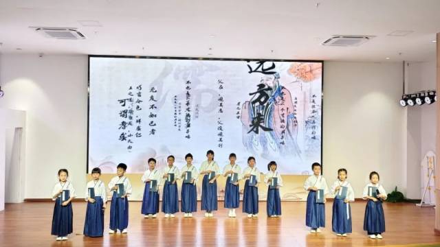 各馆经典诵读班的学员们,身着汉服、手持竹简,以稚嫩的童声,将暑期以来所学的《论语》和五邑先贤诗歌名篇,用吟诵、情景剧、粤语诵读等多元形式,为我们呈现了一场精彩的文化盛宴。一个半小时的沉浸式展演,为第二期五邑公共图书馆经典诵读班画上了圆满的句号。