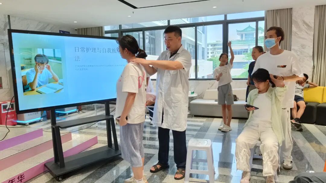周老师团队现场为学生和家长开展义诊。三位老师手法娴熟,精准找穴,孩子们紧绷的肌肉在轻柔有力的推拿下逐渐放松,家长们也舒展了因操劳而酸痛的肩颈,现场不时传来惬意的轻叹,每个人都沉浸在按摩带来的舒适与快乐中。
