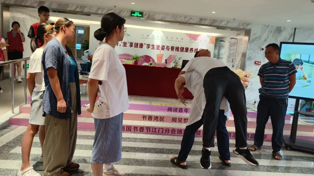 不良阅读姿势、久坐不动、长时间低头玩手机、沉重的书包压力且缺乏体育锻炼和运动,先天性脊柱畸形或骨骼发育异常等因素,这些常被忽略的行为,却如同一个个隐形的杀手,悄悄侵蚀着孩子们的脊柱健康。周老师现场示范了正确的坐姿:背部挺直,肩膀放松,眼睛平视前方。另外,他提醒大家,无论是学习还是工作,都要定时起身活动,避免长时间保持一个姿势。