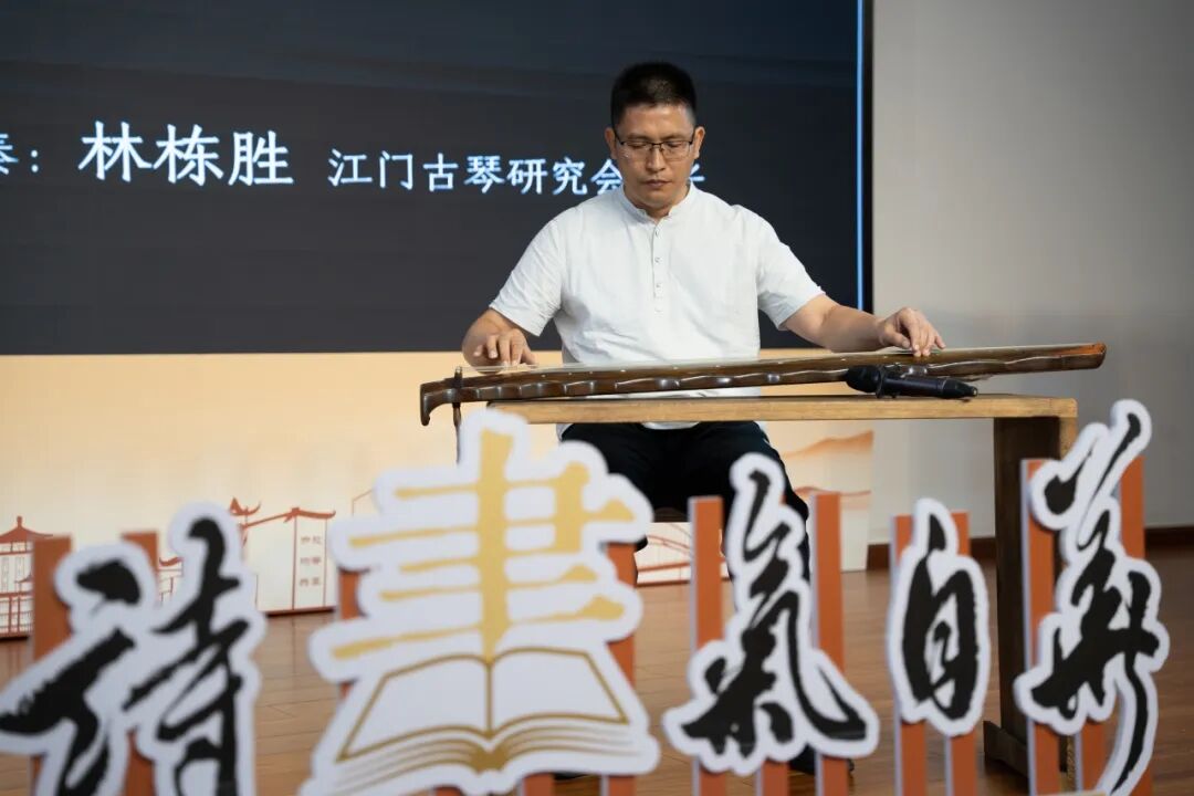 江门市非遗“冈州古琴艺术”市级代表性传承人林栋胜用古琴为大家演奏名曲《阳关三叠》。他指尖下流淌出的悠扬琴音,琴韵悠远,余音绕梁,仿佛带着观众穿越时空,感受着古人送别时的不舍与深情,彰显了诗歌意境的深远。