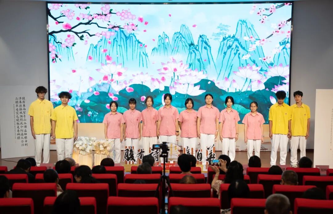 由新会陈经纶中学艺术科长李岚指导,陈经纶中学合唱团演唱李白《清平调》和孟浩然《舟中晓望》。同学们以清澈的嗓音、真挚的情感,将诗歌中的韵味与意境完美呈现,诗乐相融,以声传情,充分展示了诗歌独特的优美韵律,给观众带来了一场视听盛宴。