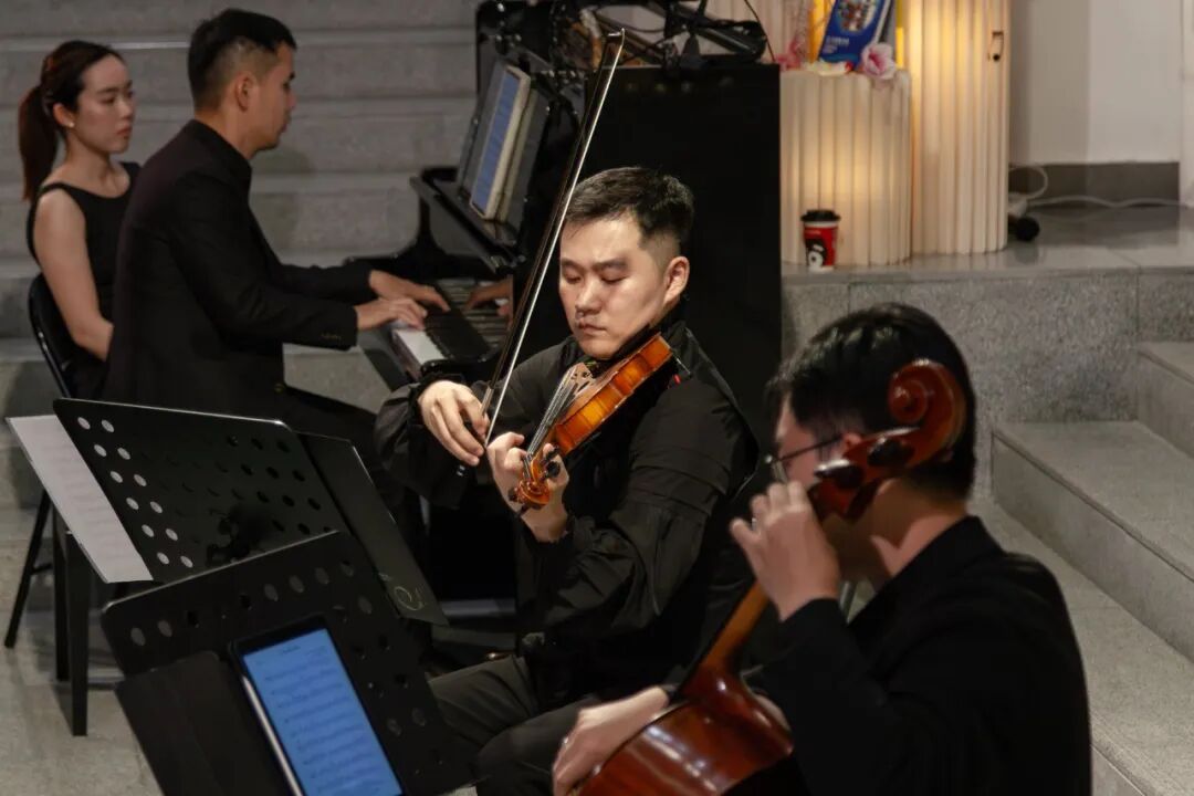 独奏与重奏同样扣人心弦。吕启琛老师钢琴独奏《即兴曲》灵动诠释舒伯特的即兴之美;四重奏《梁祝》选段则以东方韵味将整场演出推向了高潮。舞台之美,曲目之美,旋律之美,书香之美,再加上生活之美!观众们沉醉其中!每当一首曲目结束时,掌声此起彼伏,观众的脸上洋溢着美好幸福,憧憬着美好生活。