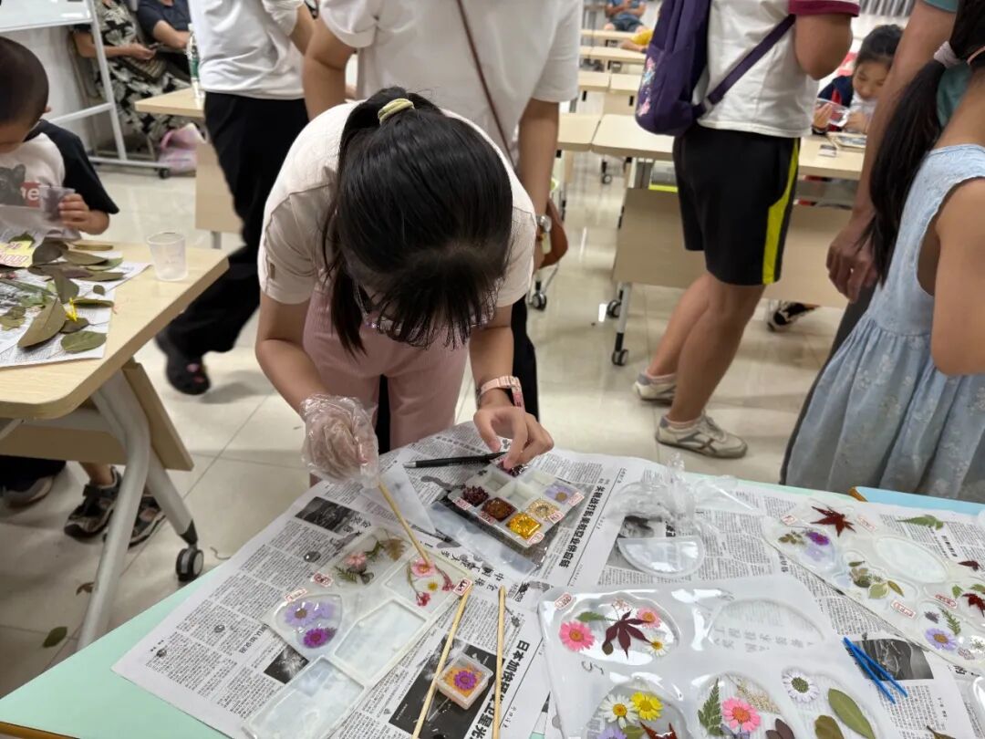 科普制作环节增设琥珀标本制作活动,孩子们在教师指导下,了解琥珀形成原理与科学价值,亲手将植物标本嵌入树脂,经搅拌、塑形、固化完成专属标本,在实操中直观感受生物与地质科学的关联,拓宽科学认知边界。