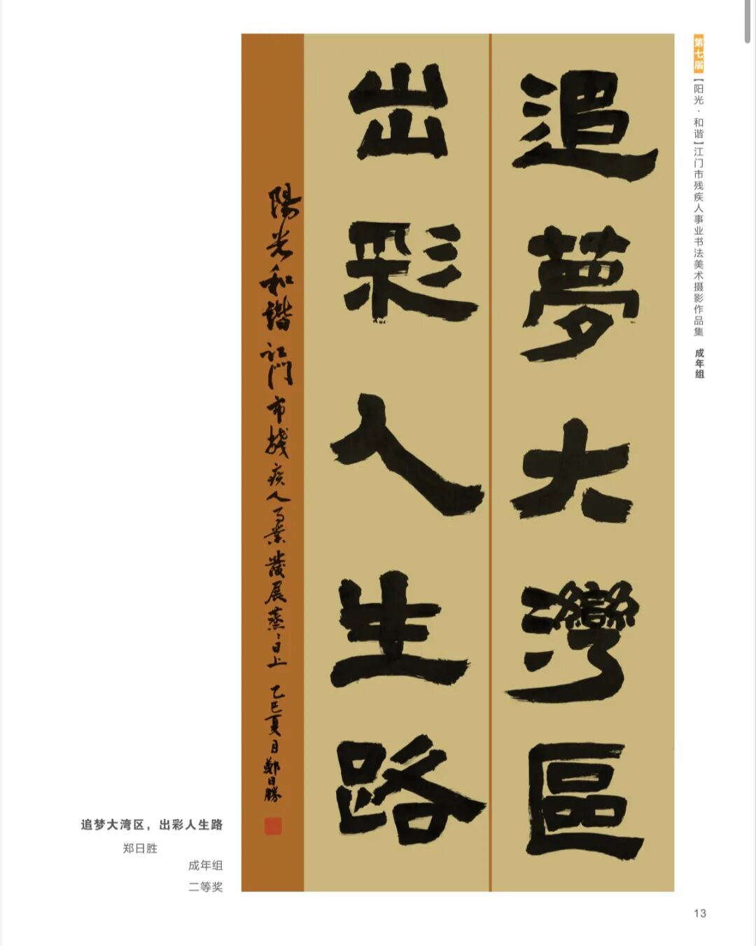 二等奖获得者郑先生的作品《追梦大湾区,出彩人生路》,其雄浑有力的笔锋令人惊叹。“我练习书法多年,”郑先生说,“最初是为了康复训练,后来真正爱上了这门艺术。书法让我的生活有了重心和方向。”