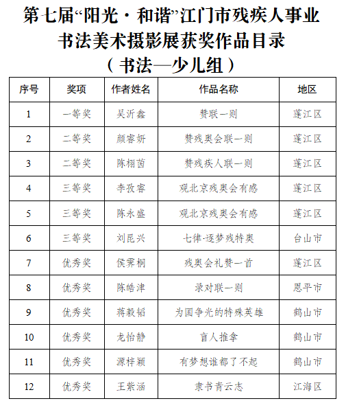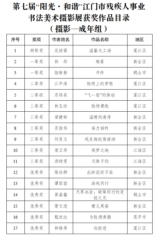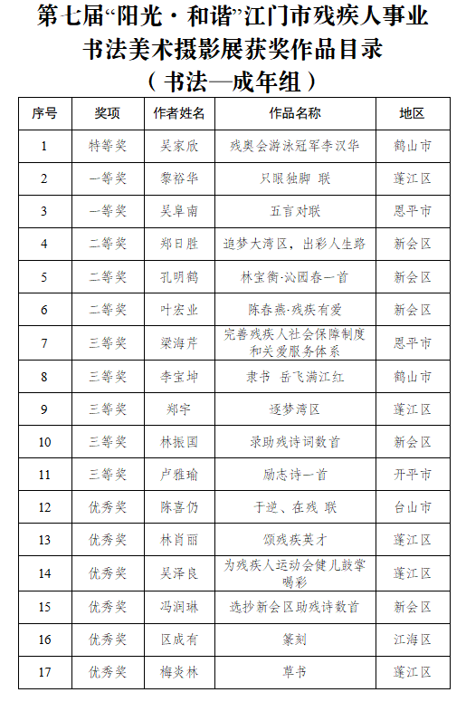 9月15日,由江门市残联、市文广旅体局、市文联共同举办的第七届“阳光·和谐”江门市残疾人事业书法美术摄影展在江门市文化馆隆重开幕。市政府副秘书长岑明俸,市残联党组书记、理事长叶芳华,市文广旅体局党组成员、副局长周传艳以及市直相关部门领导、十五运会及残特奥会江门赛区执委会成员单位代表、获奖者代表还有市民们共同参与了这一极具意义的活动。