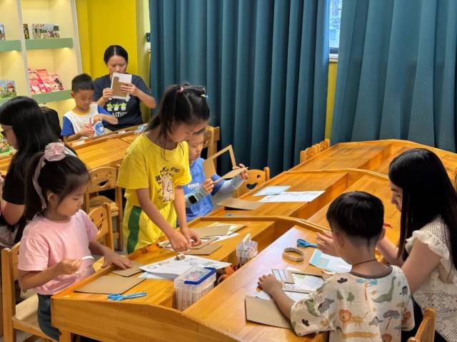 绘本讲读后,进入充满创意的手工制作环节。文化志愿者老师为每组家庭发放了手工“华容道”材料包,并详细讲解了传统益智游戏的历史背景与拼装技巧。亲子家庭分工协作,有的负责涂色描框,有的专注研究拼图布局,现场充满了欢声笑语。