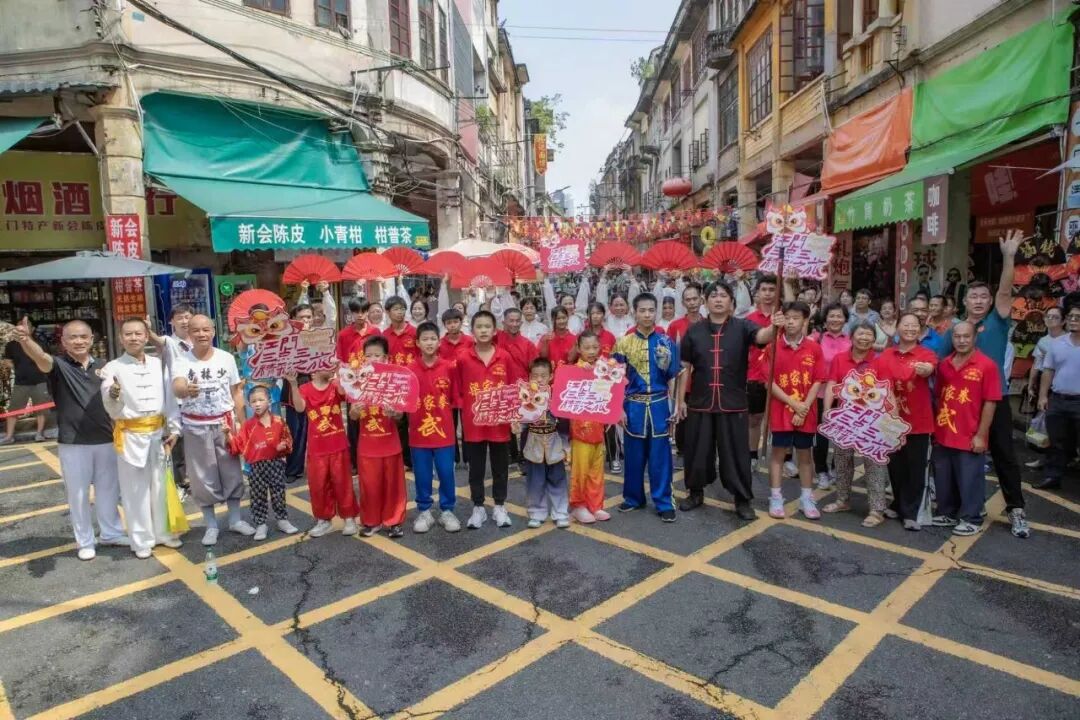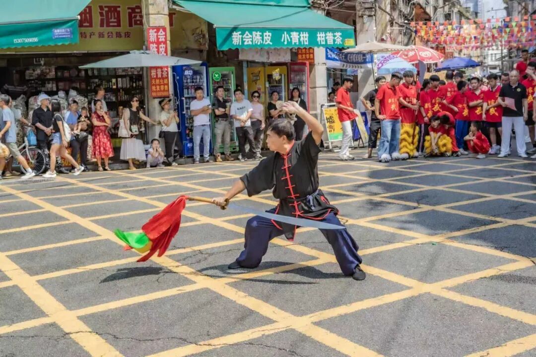 10月1日上午,“武动墟街”武术专场在国庆当天的明媚阳光中率先登场。 演出在气势恢宏的《醒狮勇闯高峰》中拉开帷幕,醒狮矫健灵动,瞬间点燃现场气氛。随后的兵器表演精彩纷呈:少林九节鞭呼啸生风,武当长穗剑飘逸潇洒,中华苗刀气势如虹,蔡李佛柳叶刀令人目不暇接……而拳法展示同样引人入胜:李家长拳沉稳刚健,咏春拳短桥窄马,少儿南拳虎虎生威……每一个节目都为祖国76华诞献上了最具力量的祝福。活动尾声,侨乡武术集体献礼将演出推向高潮。现场掌声雷动,观众们纷纷举起手机记录精彩瞬间。