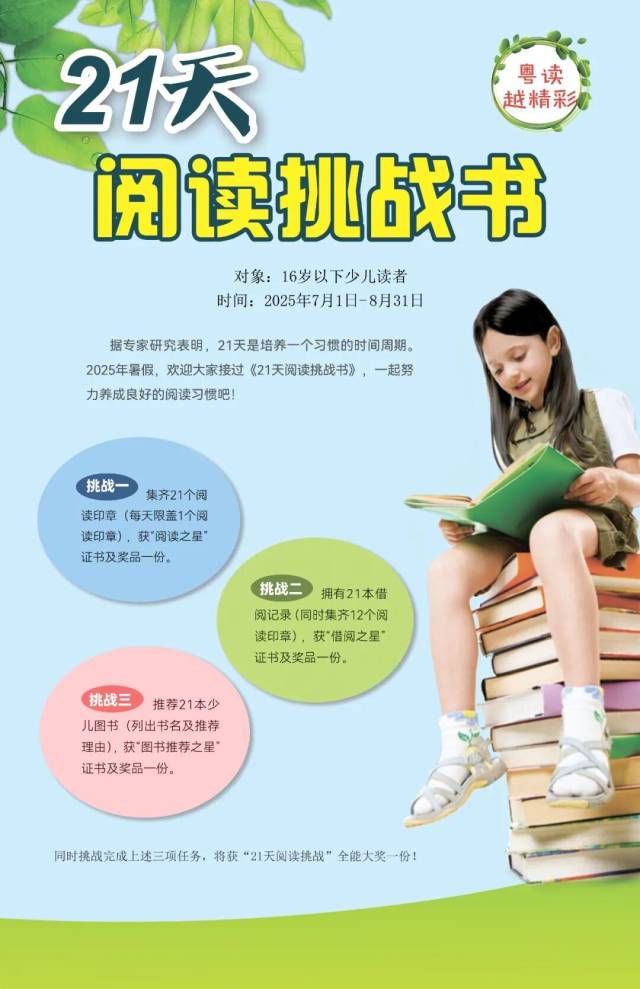 为鼓励和引导少年儿童养成良好的阅读习惯,让更多的小读者参与到阅读行列中来,营造全民阅读氛围,江门市图书馆积极参与由广东省立中山图书馆牵头主办的2025年“粤读越精彩”21天阅读挑战书——少儿阅读习惯养成活动,让小读者们在轻松愉快的假期中,通过阅读来丰富自己的内心世界,拓宽视野,增长知识。
