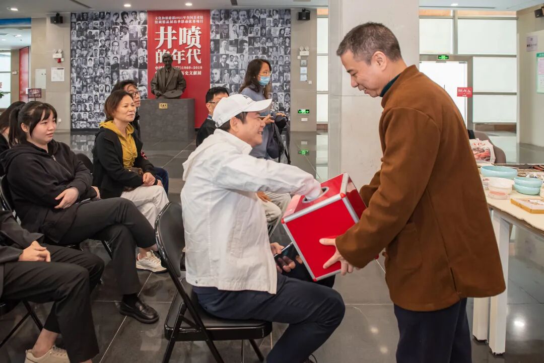 阮国新先生现场以花卉为主题进行小品创作,接连创作了《春色》《金色年华》《朝霞》三幅作品。作品笔墨鲜活,既精准勾勒花之形态,又借色彩传递神韵。增设的抽奖环节更是将氛围推向高潮,三位幸运观众分别抽中这三幅创作小品,中奖者兴奋与阮国新先生近距离合影。