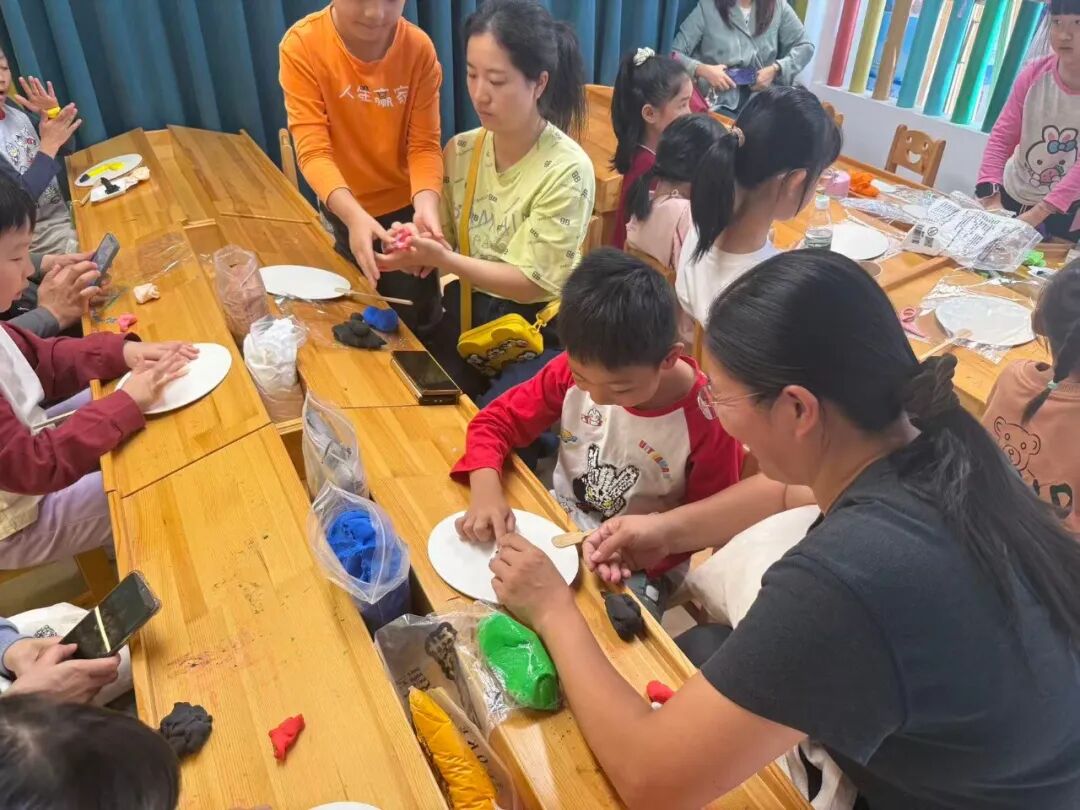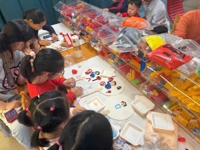 拿到材料后,孩子们立刻兴奋地行动起来。有的孩子用蓝色黏土捏出 “小锁” 的形状,寓意着保护自己的网络信息;有的孩子用红色黏土捏出 “禁止符号”,提醒大家远离不良网络内容;还有的家庭合作,在团扇上捏出一家人手拉手的造型,象征着家人共同守护网络安全。家长们耐心地陪伴在孩子身边,帮助他们揉捏黏土、调整造型,偶尔和孩子讨论创意,现场充满了温馨的创作氛围。