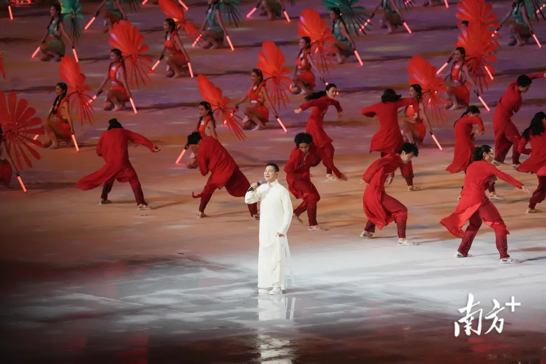 “手牵着手不分你我,昂首向前走,让世界知道我们都是中国人。”开幕式上,江门籍香港明星刘德华压轴登场,以一曲《中国人》升华“同梦同圆”的主题。陈小春等明星演绎的歌曲《海阔天空》,作词作曲者正是江门台山籍的黄家驹。此外,容祖儿也倾情献声,她的祖籍也是江门。