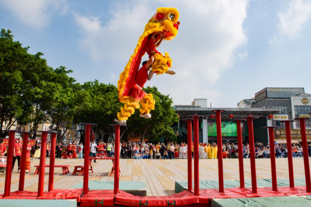 在精彩纷呈的武术展演环节,蔡李佛拳、咏春拳、梁家拳等13个代表队、9个非遗武术龙狮团队联袂献艺。展演在振奋人心的《高桩狮艺》中震撼开场,醒狮在高耸的梅花桩上闪转腾挪,将武术身法与狮艺技巧完美融合,引得观众阵阵喝彩。随后,《龙腾江海》的舞龙表演气势磅礴,长龙在舞者手中翻腾起舞,展现出南派舞龙的独特神韵。紧接着,各派武术轮番登场:刚猛霸道的蔡李佛拳虎虎生风,南派拳械表演刀光剑影,功夫扇表演则将太极的圆活与南拳的刚劲完美融合。咏春拳的寸劲发力、周家拳的稳健架势、武当武术的飘逸灵动,各具特色,相得益彰。创新节目《大美空竹、中国龙》更是将现场气氛推向高潮,健身龙舞动如虹,花样空竹上下翻飞,展现出传统体育项目的时尚活力。