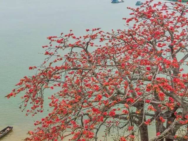 大鳌镇红卫岛江边的古木棉,被誉为“五邑最美的木棉树”,属于国家二级古树。三百年来,静静地耸立于西江河畔,遥望对岸,见证着大鳌的变迁与发展。这棵生长在河岸上的木棉形态优美,弯腰贴着水面,在绿树红花的掩映之间,西江河上偶尔有板船悠悠驶过,濛濛细雨间红树和渔船构成一幅充满了诗情的画卷。每年三月,红花挂满枝头,如诗如画,因而吸引大量摄影爱师慕名而来,争相摄影。