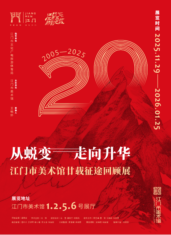 为广泛传播美术馆的文化价值,激发公众对艺术的热爱,促进文化交流,展现江门的艺术魅力,为城市文化发展注入新的活力,由江门市文化广电旅游体育局指导,江门市美术馆主办的建馆二十周年特别展览“从蜕变走向升华——江门市美术馆廿载征途回顾展”于11月29日在江门市美术馆开展。展览系统回顾了美术馆自2005年成立以来,从无到有、从探索到成熟的完整历程,通过大量珍贵的文献、作品与影像资料,向公众讲述一段属于江门的艺术成长故事。