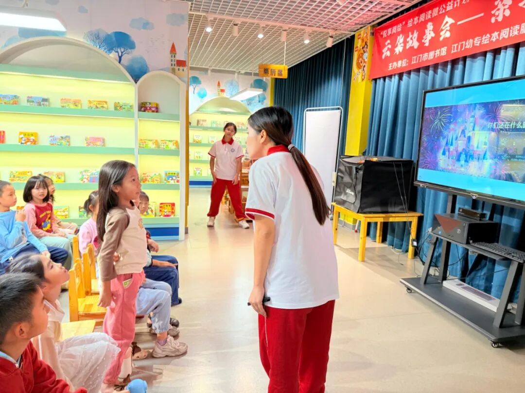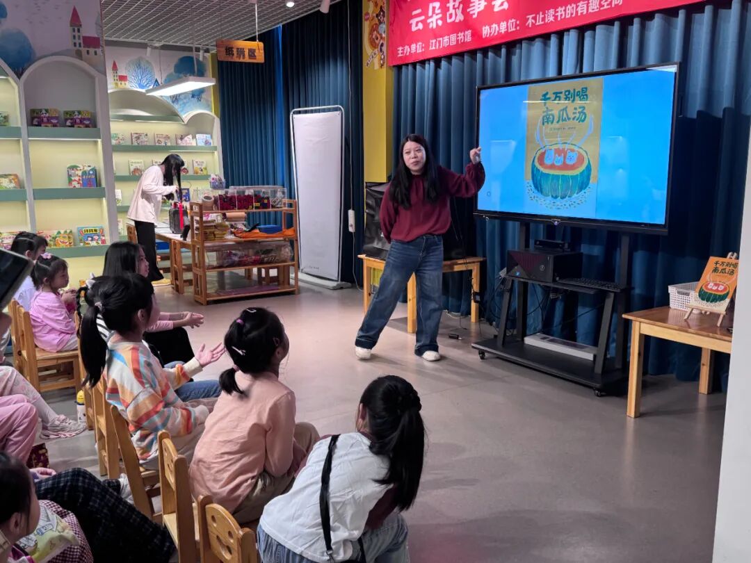 “在寒冷的天气里,白熊、羊驼和小猫走在回家路上,突然闻到一股香喷喷的味道——顺着香味找过去,竟发现一个巨大的南瓜!旁边木板上写着南瓜汤泡澡池,请随心所欲地泡澡,但千万别喝南瓜汤。”文化志愿者老师用温柔又富有感染力的声音,把故事中“好奇心与规则”的核心冲突缓缓铺开。