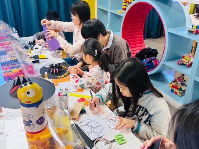 故事结束后,备受期待的延伸手工环节——“万圣节帽子制作” 正式开启。在文化志愿者老师的引导下,亲子家庭将绘本主题与创意表达深度融合,家长与孩子一同回顾《千万别喝南瓜汤》中“南瓜汤泡澡池”“小动物变橙色”等关键情节,确定帽子基础造型。有的家庭用橙色卡纸卷出“巫师帽”,呼应小动物变身后的橙色;有的将卡纸对折剪出 “南瓜帽”,用绿色卡纸做瓜蒂,还原故事中的核心元素“南瓜”,从造型上紧扣绘本主题。