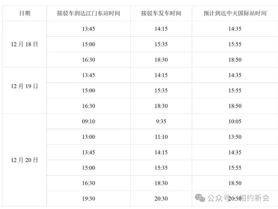 为方便外地跑友快捷顺利的到达五邑华侨广场领取参赛物资,组委会在2025年12月18日-12月20日特设置江门东站、江门站免费接驳车。选手到达江门站或江门东站后,可根据志愿者及指示牌的指引,凭参赛短信或报名成功页面截图上车。