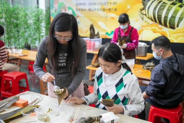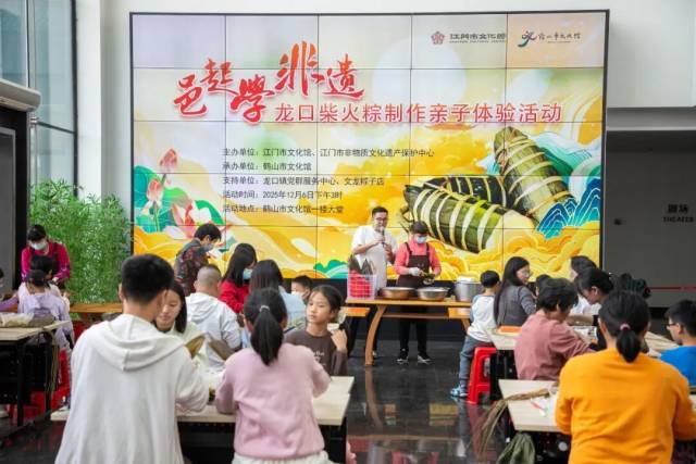 12月6日下午,鹤山市文化馆粽叶飘香。20对亲子在"‘邑’起学非遗——龙口柴火粽制作亲子体验活动"中共同感受了龙口柴火粽制作的独特魅力。孩子们了解了作为鹤山市县级非遗项目的龙口柴火粽的历史和特点,品尝了美味的柴火粽,并与家长一起制作了龙口柴火粽。现场充满了欢声笑语,其乐融融。